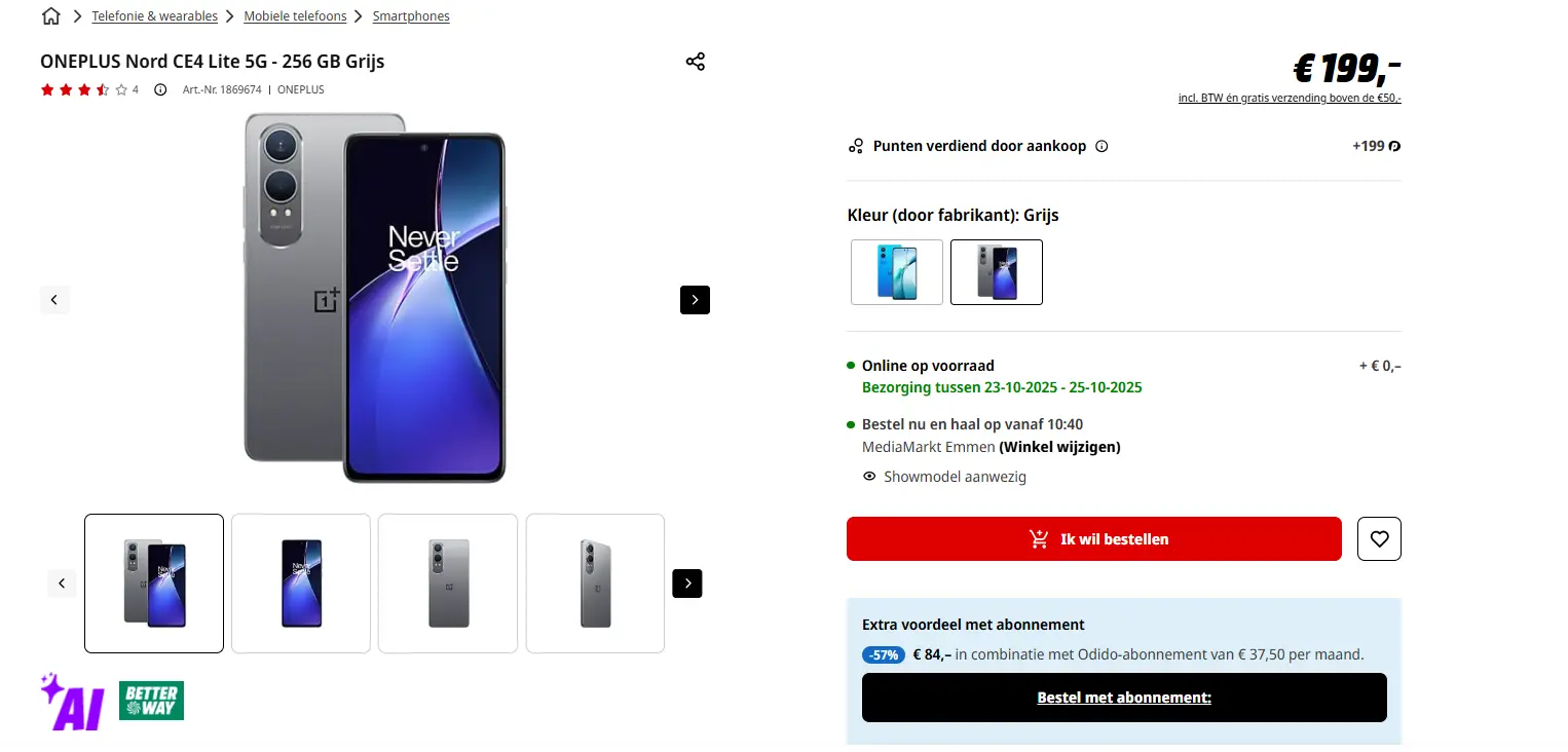 - Aanbieder: Media Markt EmmenONEPLUS Nord CE4 Lite 5G -256 GB GrijsDe Nord CE4 Lite 5G draait soepel dankzij de Snapdragon 695-chipset en 16 GB RAM (waarvan 8 GB virtueel geheugen). Hierdoor schakel je makkelijk tussen apps, kun je probleemloos gamen of video’s bewerken zonder dat de telefoon traag wordt. Met 256 GB aan opslagruimte is er genoeg plek voor foto’s, video’s, apps en meer. Heb je nóg meer ruimte nodig? Dan kun je het geheugen uitbreiden met een microSD-kaart tot wel 2 TB, wat bijzonder handig is voor wie veel content opslaat. € 200,00Categorie: Elektronica
