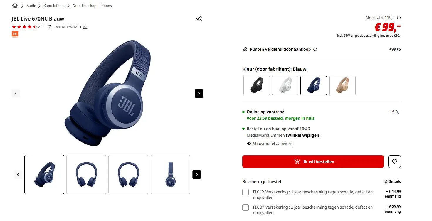 - Aanbieder: Media Markt EmmenJBL Live 670NC verschillende kleurenMuziek klinkt meeslepender met de met de stijlvolle JBL Live 670NC Zwart. Deze draadloze on-ear-koptelefoon heeft een comfortabel ontwerp, met een gewatteerde hoofdband en zachte oorkussens zodat hij de hele dag prettig blijft zitten. En dankzij zijn lange batterijduur tot 65 uur (met noisecancelling uit) en handige opbergtas neem je hem ook probleemloos overal mee naartoe, of je nu uren in de trein zit of heerlijk door het bos wandelt. Is de batterij toch leeg? Dan heb je binnen 5 minuten snelladen alweer 4 uur luisterplezier. Verder bepaal je met de Live 670NC zelf hoeveel omgevingsgeluid je hoort. Kies voor True Adaptive Noise Cancelling om je even helemaal af te zonderen van de wereld om je heen. Dat is bijvoorbeeld handig tijdens het studeren. Of kies voor Smart Ambient om je bewust te blijven van je omgeving, bijvoorbeeld wanneer je deelneemt aan het verkeer. Dit gaat niet ten koste van de geluidskwaliteit dankzij de kenmerkende JBL Signature-geluidstechnologie en het meeslepende JBL Spatial-surroundsound. Elke noot klinkt dus hoe dan ook glashelder. En je hoeft geen seconde te missen van je favoriete nummers, want de audio wordt automatisch gepauzeerd wanneer je de bluetoothkoptelefoon afzet. Wanneer je hem weer opdoet, hervat de muziek ook gelijk. Geen gedoe dus! Wil je nog meer controle over jouw luisterervaring? Download dan de JBL Headphones-app. Hierin stem je de audio eenvoudig af op jouw gehoor met Personi-Fi 2.0 en switch je naadloos tussen de Audio-modus (voor muziek) of Video-modus (voor films en games). En over switchen gesproken. Dankzij de multi-pointfunctionaliteit wissel je eenvoudig tussen de output van 2 apparaten. Ga van een video op je tablet naadloos over naar een telefoontje op je smartphone. Daarnaast bel je met deze koptelefoon eenvoudig handsfree dankzij 2 microfoons met beamforming, en gebruik je moeiteloos jouw stemassistent voor extra gemak. De mogelijkheden zijn eindeloos! € 75,00Categorie: Elektronica