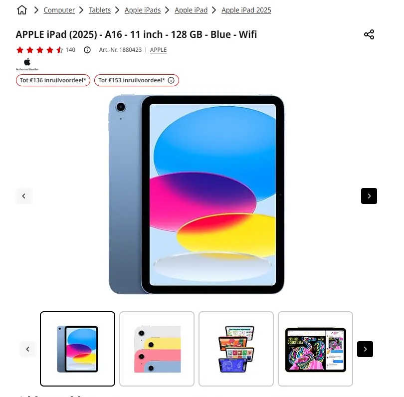 - Aanbieder: Media Markt EmmenAPPLE iPad (2025) - A16 - 11 inch - 128 GB - Blue - WifiMet de meegeleverde USB-C-connector kan je de iPad en Apple accessoires snel opladen. De batterij van de iPad gaat echter tot wel een dag mee, dus je kan meer doen zonder al te vaak te hoeven opladen. Dankzij de supersnelle Wi-Fi6E- en 5G2-connectiviteit (beschikbaar op bepaalde modellen) is je internettoegang altijd stabiel en snel. De iPad is ook voorzien van Touch ID-beveiligde verificatie om je gegevens te beschermen en de toegang tot iPad en je Apple Pay-account te regelen. € 389,00Categorie: Elektronica
