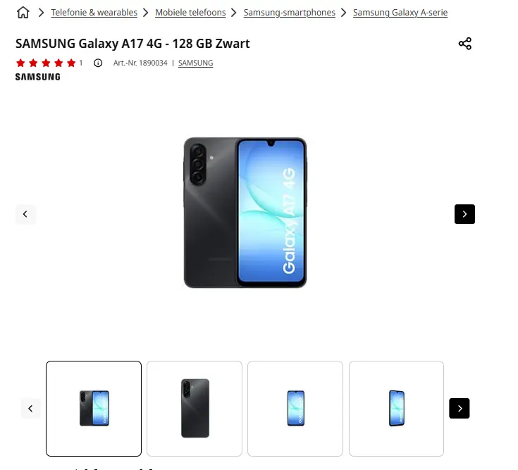 - Aanbieder: Media Markt EmmenSAMSUNG Galaxy A17 4G - 128 GB ZwartDe Samsung Galaxy A17 4G 128GB in zwart combineert snelheid, kracht en gebruiksgemak. Dankzij de Exynos 1330 processor en snelle 4G-connectiviteit schakel je moeiteloos tussen apps, games en sociale media. Bovendien geniet je op het ruime 6,9-inch-Super-amoled-scherm met een verversingssnelheid van 90 Hz van haarscherpe beelden en vloeiende overgangen. Verder legt de drievoudige 50MP camera, samen met de 13MP selfiecamera, elk moment scherp en gedetailleerd vast. Daarbij biedt 128 GB opslag, uitbreidbaar tot 2 TB, voldoende ruimte voor al je bestanden. Tot slot gaat de 5000 mAh batterij lang mee en laadt snel op via USB C. € 199,00Categorie: Elektronica