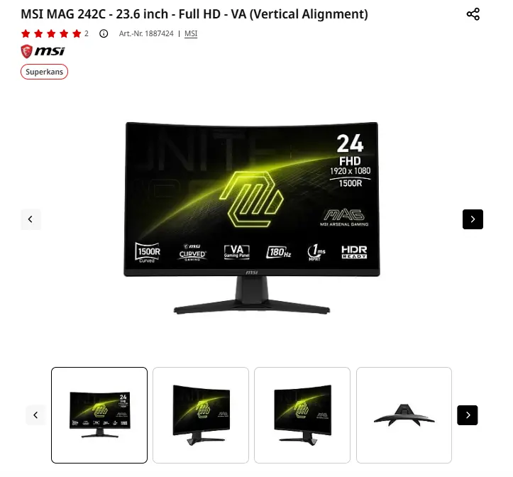 - Aanbieder: Media Markt EmmenMSI MAG 242C monitor - 23.6 inch - Full HDDe MSI MAG 242C gaming-monitor in zwarte uitvoering tilt je game-ervaring naar een hoger niveau. Zijn gebogen VA-display met 23,6-inch-beelddiagonaal levert een heus spectrum van kleuren in Full-HD. De hoge beeldverversingssnelheid van 180 Hz en 1 ms reactietijd geven op hun beurt elke beweging vloeiend weer. De monitor beschikt ook over slimme beeldtechnieken, zo ontrafelt de AI Vision-technologie het kleinste detail in de donkerste krochten. De MSI-monitor zit verpakt in een stoere, stijlvolle MAG-behuizing (MSI Arsenal Gaming) die naast zijn robuust ontwerp ook zeer functioneel is, en langdurige gamesessies aankan. Om je gamestation compleet te maken is deze MAG-monitor voorzien van allerhande aansluitmogelijkheden, waaronder een HDMI-poort en een DisplayPort-ingang. Zo sluit je er makkelijk je gaming-pc, console of laptop op aan. € 125,00Categorie: Elektronica