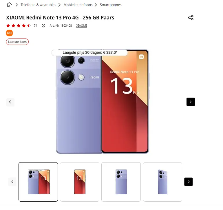 - Aanbieder: Media Markt EmmenXIAOMI Redmi Note 13 Pro 4G - 256 GB PaarsMet de Xiaomi Redmi Note 13 Pro 4G leg je elk moment haarscherp vast. Het drievoudige camerasysteem beschikt namelijk over een 200-megapixelhoofdcamera die optische beeldstabilisatie ondersteunt. Van dichtbij of veraf, stilstaand of in beweging en bij dag of nacht: de foto’s zijn ware meesterwerken. De resultaten van jouw opnames zie je terug op een helder en krasbestendig 6.67-inch-display met amoledtechnologie. Dit ondersteunt ook 120 Hz beeldverversingssnelheid, zodat je geniet van een vloeiende beeldervaring wanneer je gamet of door je apps scrolt. Zeker door de dunne bezel, waardoor er meer schermruimte is. Jouw videocontent krijgt overigens nog meer dimensie dankzij de Dobly Atmos-technologie. En dankzij de drievoudige TÜV Rheinland-certificering is het ook zeer oogvriendelijk. En de finishing touch is een geïntegreerde vingerafdruksensor op het scherm om je toestel te ontgrendelen. De Redmi Note 13 Pro 4G met 256 GB presteert verder soepel dankzij de octa-coreprocessor met MediaTek Helio G99-Ultra-chipset, het 8GB-werkgeheugen en een 5.000mAh-batterij die turbo-opladen tot 67 watt ondersteunt. Na 46 minuten is hij weer volledig opgeladen. € 250,00Categorie: Elektronica