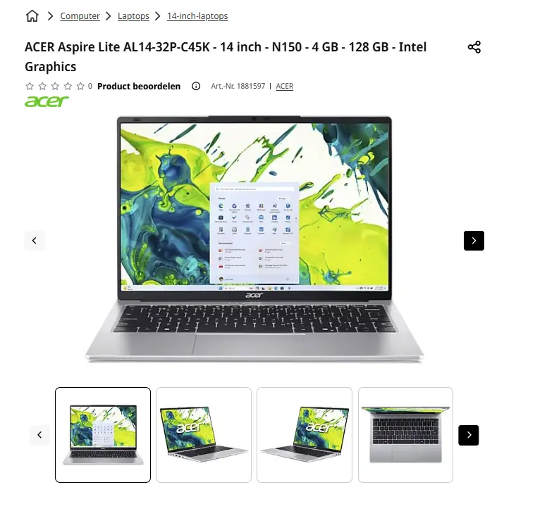 - Aanbieder: Media Markt EmmenACER Aspire Lite AL14-32P-C45K- 14 inch laptopDe Aspire Lite AL14-32P-32LE laptop in grijze uitvoering garandeert steeds een vlotte werking met minieme laadtijden. Met zijn 1,1 kilo is hij uitzonderlijk licht, waardoor je hem eenvoudig overal met je meeneemt. Hij heeft een modern en duurzaam ontwerp in een kunstof behuizing voor langdurig gebruik. Zijn Intel Processor N150-processor met 4 GB aan RAM klaart probleemloos lichte taken. Daarnaast laat het helder 14 inch-display in combinatie met de Intel-videokaart de graphics goed tot hun recht komen in WUXGA-beeldkwaliteit. Je bekijkt jouw favoriete films en series dus in een vloeiende resolutie. Verder is deze Acer Aspire Lite voorzien met 128 GB aan opslag en je sluit er gemakkelijk meerdere apparaten op aan via de vele USB-poorten met DisplayPort en HDMI. € 300,00Categorie: Elektronica