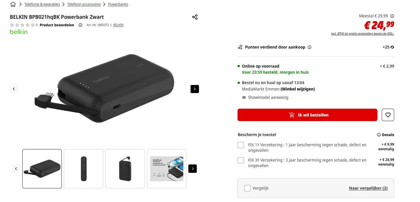 - Aanbieder: Media Markt EmmenBELKIN BPB021hqBK Powerbank Zwart 10.000 mAhOf je nu op reis bent, of je oplader is zoek: de zwarte powerbank van Belkin geeft je batterijvermogen voor elke gelegenheid, dankzij de 10.000 mAh. De powerbank heeft 20 watt vermogen en 2 USB-C poorten waarmee je 2 apparaten tegelijk kunt opladen. Eén van de poorten is bevestigd aan een geïntegreerde kabel die in een groef aan de zijkant van de powerbank past voor eenvoudig transport. € 25,00Categorie: Elektronica