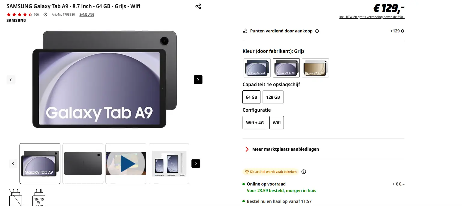 - Aanbieder: Media Markt EmmenSAMSUNG GALAXY TAB A9 64GB WIFI GRAYDe Samsung Galaxy Tab A9 Wifi Grafiet is een compacte tablet van 8.7 inch (22.1 cm) voor de hele familie. Dit gebruiksvriendelijke device is gemakkelijk mee te nemen voor onderweg en beschikt over veelzijdige luidsprekers om op elk moment te genieten van jouw favoriete (kids)content. Multitask in meerdere apps, sla al jouw favoriete foto’s en video’s op, en kijk films en series of check je socials via de stabiele wifiverbinding. € 129,00Categorie: Elektronica