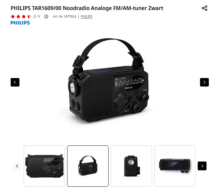 - Aanbieder: Media Markt EmmenPHILIPS TAR1609 NoodradioDe Philips TAR1609/00 is een echte survival essential. Deze compacte, draagbare radio heeft een uitstekende ontvangst van FM- en AM-zenders, waardoor je hem gerust meeneemt als je een paar dagen gaat kamperen. De ingebouwde li-ionbatterij biedt een luistertijd van maximaal 32 uur. Opladen kan gewoon met de meegeleverde USB-C-kabel, maar andersom is het ook mogelijk om de radio weer te gebruiken om andere apparaten op te laden. Maar geen zorgen dat je zonder stroom komt te zitten. De radio heeft namelijk ook zonnepanelen aan de bovenkant voor back-upvoeding, of je gebruikt de zwengel om handmatig stroom op te wekken. Zelfs AAA-batterijen zijn een optie (niet meegeleverd). Deze handige radio komt goed van pas bij noodgevallen, want naast radio-ontvangst heeft hij ook een geïntegreerde zaklamp en een luid SOS-alarm met lichtflits. Zo weet jij de aandacht te trekken in een benarde situatie, met alleen een druk op de knop. € 25,00Categorie: