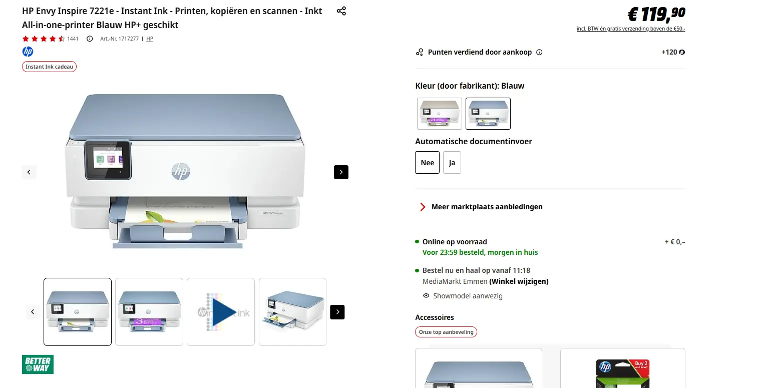 - Aanbieder: Media Markt EmmenHP Envy inspire 7221E all-in-one- printerDe HP ENVY Inspire 7221E is een wit-blauwe printer met een duurzaam design, want hij is namelijk voor 45% gemaakt uit gerecycled plastic. Op de behuizing zit een gebruiksvriendelijk 2.65-inch-touchscreendisplay om de cartridgeprinter zeer eenvoudig te bedienen. Aan de linkerkant hiervan zie je of je verbonden bent en wanneer er iets fout gaat. Het is bijvoorbeeld belangrijk dat je in deze printer cartridges met nieuwe of hergebruikte HP-chips of elektronische HP-circuits stopt, want anders blokkeert de dynamische beveiliging de printer. Al jouw documenten worden afgedrukt met inkjet-printtechnologie, zodat elke (foto)pagina van kwaliteit is. € 100,00Categorie: Elektronica