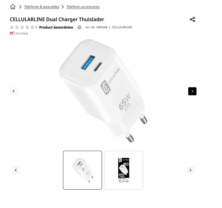 - Aanbieder: Media Markt EmmenCELLULARLINE Dual Charger ThuisladerLaad tot 2 apparaten snel en veilig op met deze Cellularline Dual Charger-oplader. De oplader beschikt over een USB-C-poort met een maximaal uitgangsvermogen van 65 watt. Deze poort is geschikt voor het opladen van smartphones, tablets en laptops. Gebruik de USB-A-poort met een vermogen van 12 watt voor het opladen van telefoons en andere kleine apparaten. Dankzij de compacte behuizing neem je de oplader gemakkelijk met je mee, bijvoorbeeld naar kantoor of op reis. € 10,00Categorie: Elektronica