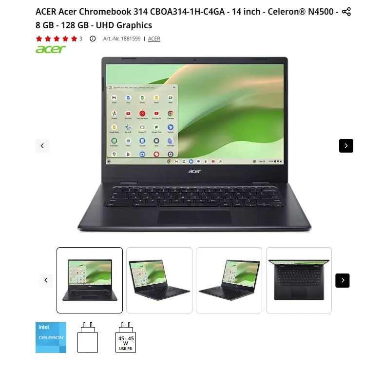 - Aanbieder: Media Markt EmmenAcer Chromebook 314 CBOA314-1H-C4GA - 14 inch laptopDe Acer Chromebook 314 CBOA314-1H-C4GA is ideaal voor studenten en professionals die een betrouwbare en draagbare laptop nodig hebben voor werk en studie. Hij is uitgerust met een Intel Celeron N4500-processor en 4 GB LPDDR4X RAM, wat zorgt voor soepele prestaties bij dagelijkse taken zoals surfen op het web, e-mailen en tekstverwerking. De 64 GB eMMC-opslag biedt ruimte voor essentiële bestanden en applicaties. Dankzij het gebruik van ChromeOS profiteer je van snelle opstarttijden en automatische updates, waardoor je altijd beschikt over de nieuwste functies en beveiligingsupdates. € 350,00Categorie: Elektronica